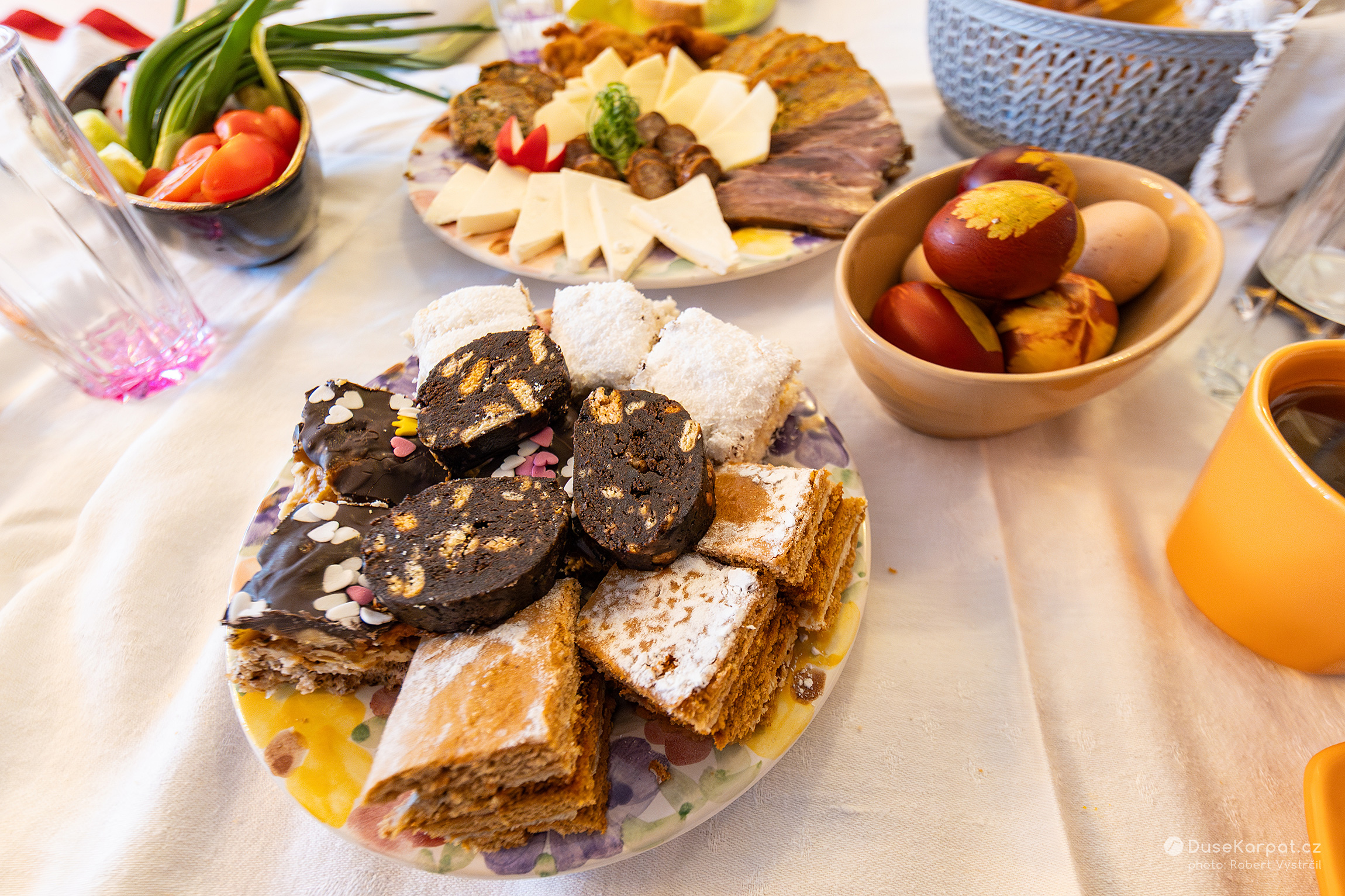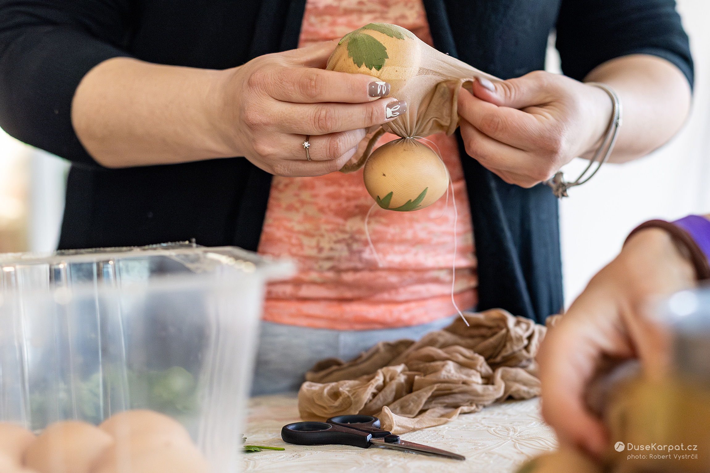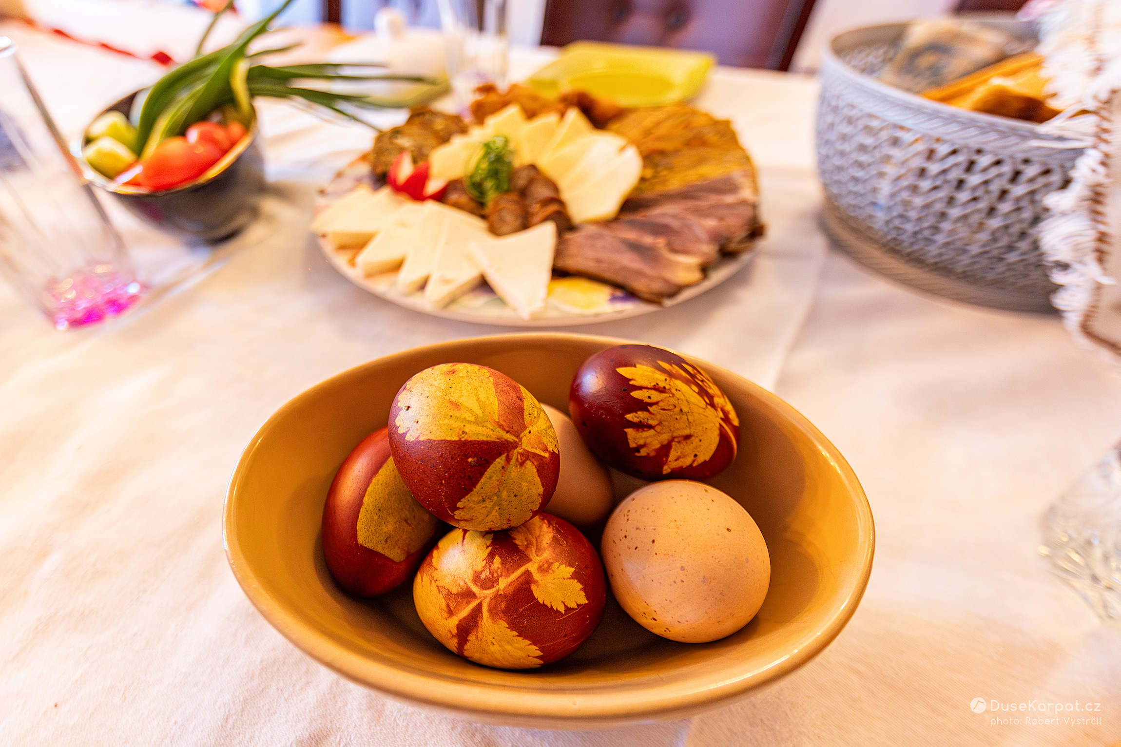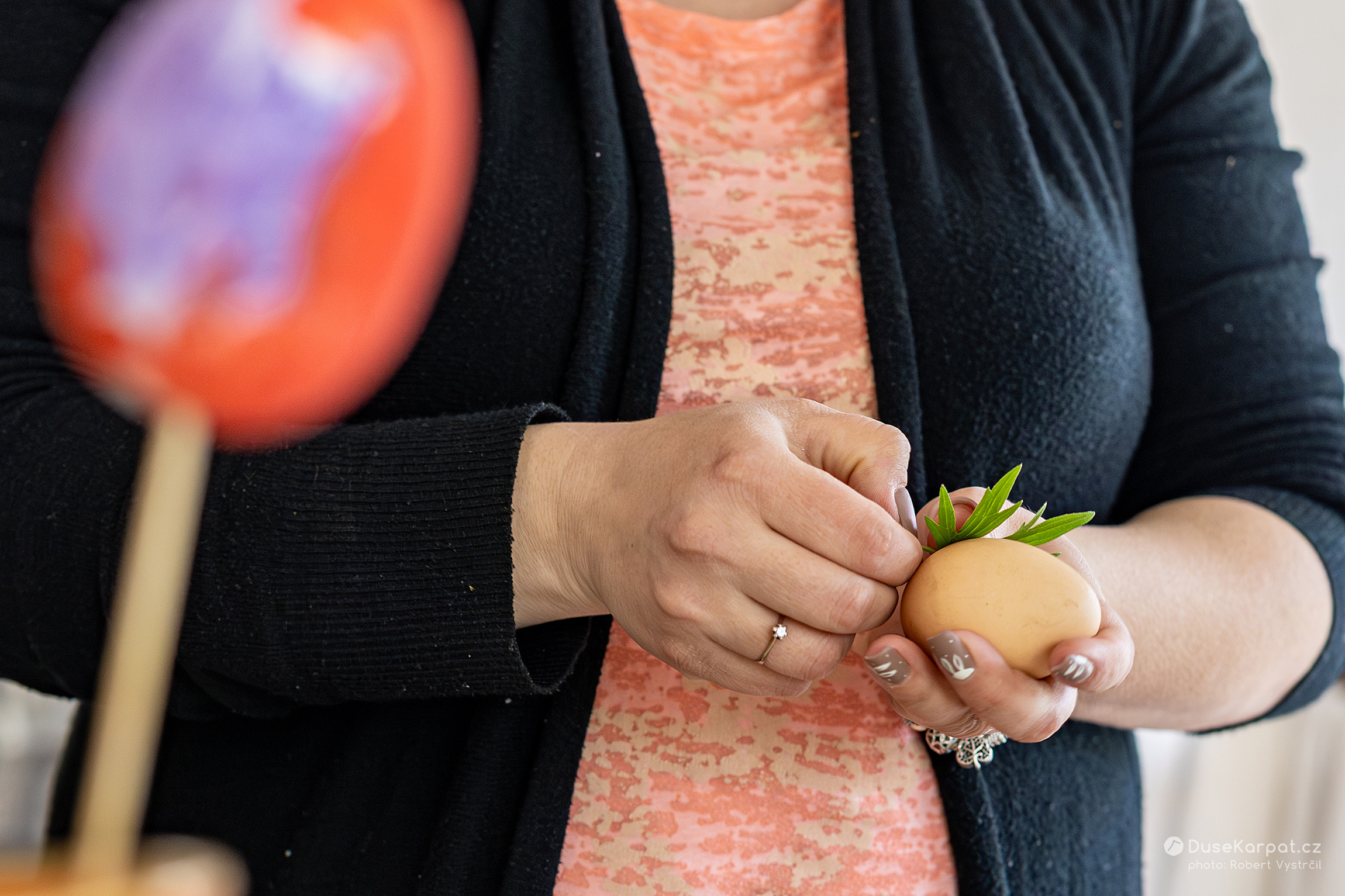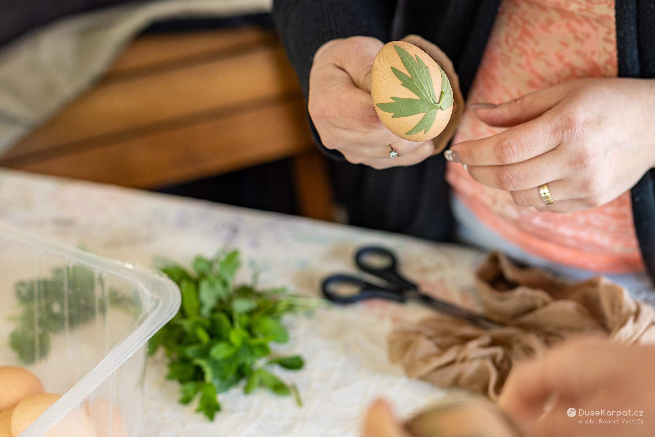 Na Velký pátek je zvykem barvit vajíčka. Nejprve si ženy a dívky nasbírají luční lístky zajímavých tvarů. Ty přitisknou ke skořápce vajíčka a celé to vloží do pružné silonky, která rostlinku udrží přilepenou k vajíčku. Vejce se dá uvařit do vody společně s cibulovými skořápkami. V místech, kde skořápka nebyla zakryta kytičkou, získá vajíčko načervenalou barvu.
